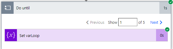 Configuration which I made is quite easy one variable and loop which will finish if varLoop equals false or after 5 runs (Count) or after 1 day (Timeout). In the loop itself added one action to set varLoop to true: